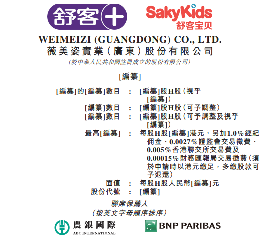 2月8日,港交所官网显示,薇美姿实业(广东)股份有限公司(下称“薇美姿”)提交了招股书,拟在港股上市,联席保荐人为农银国际、BNP PARIBAS。