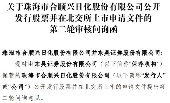 2022年2月15日,北交所官网显示,珠海市合顺兴日化股份有限公司(下称“合顺兴”)收到了第二轮监管问询,内容涉及技术先进性、经营业绩下降、境外销售真实性等方面。
