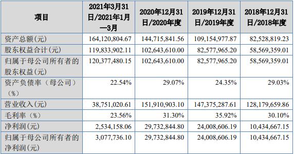 2018-2021年一季度,合顺兴的营业收入分别为1.28亿元、1.47亿元、1.52亿元、0.39亿元,归母净利润分别为1043.47万元、2400.86万元、2973.28万元、307.77万元。