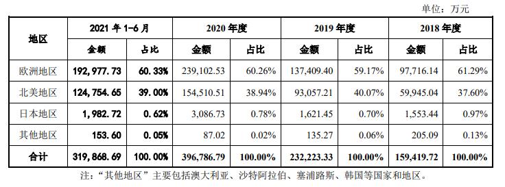 致欧科技的产品主要销往欧洲、北美、日本等国家和地区,其中,2018-2020年及2021年上半年,致欧科技来自欧洲地区的收入分别为9.77亿元、13.74亿元、23.91亿元、19.30亿元,占主营业务收入的比例分别为61.29%、59.17%、60.26%、60.33%。