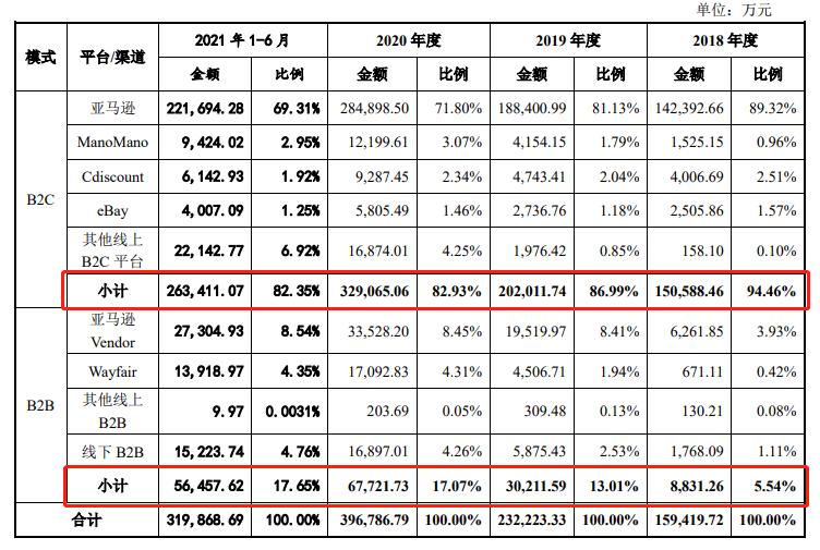 致欧科技主要通过亚马逊、Cdiscount、ManoMano、eBay等海外线上B2C平台销售产品,2018-2020年及2021年上半年,该公司线上B2C渠道实现的销售收入分别为15.06亿元、20.20亿元、32.91亿元、26.34亿元,占主营业务收入的比例分别为94.46%、86.99%、82.93%、82.35%。
