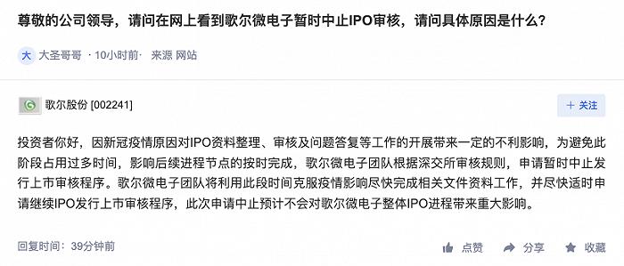 3月22日,歌尔股份在深交所互动易平台向投资者表示,因新冠疫情影响对IPO资料整理、审核及问题答复等工作的开展带来一定的不利影响,为避免此阶段占用过多时间,影响后续进程节点的按时完成,歌尔微电子团队根据深交所审核规则,申请暂时中止发行上市审核程序。歌尔微电子团队将利用此段时间克服疫情影响尽快完成相关文件资料工作,并尽快适时申请继续IPO发行上市审核程序,此次申请中止预计不会对歌尔微电子整体IPO进程带来重大影响。