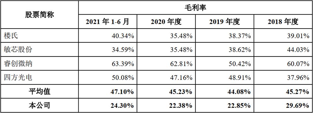 歌尔微电子2018-2020年营业收入分别为19.02亿元、25.63亿元、31.60亿元,净利润分别为3.55亿元、3.09亿元、3.78亿元。值得注意的是,歌尔微电子的毛利率远远低于楼氏电子,也低于行业平均值。以2021年上半年为例,楼氏电子毛利率为40.34%,行业毛利率平均值为47.10%,而歌尔微电子毛利率为24.30%。