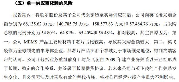从业务层面看,歌尔微电子主要从事封装测试环节,该环节的业务毛利率相对较低。关于MEMS芯片业务,歌尔微电子主要依靠外采芯片,其自研芯片应用份额较少。自2009年歌尔股份同英飞凌合作以来,歌尔股份向英飞凌采购芯片原料金额占总采购金额超过50%。