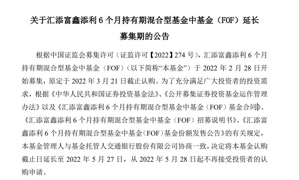 3月21日,汇添富基金发布公告称,将汇添富鑫添利6个月持有期混合型基金中基金(FOF)的认购截止日由原有的3月21日延长至2022年5月27日,5月28日起不再接受认购申请。