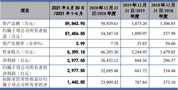 2020年,烨映微的业绩迅速提升。2018年至2021年上半年,烨映微营业收入分别为0.15亿元、0.32亿元、6.62亿元、0.54亿元,净利润分别为0.03亿元、0.08亿元、3.84亿元、0.30亿元。