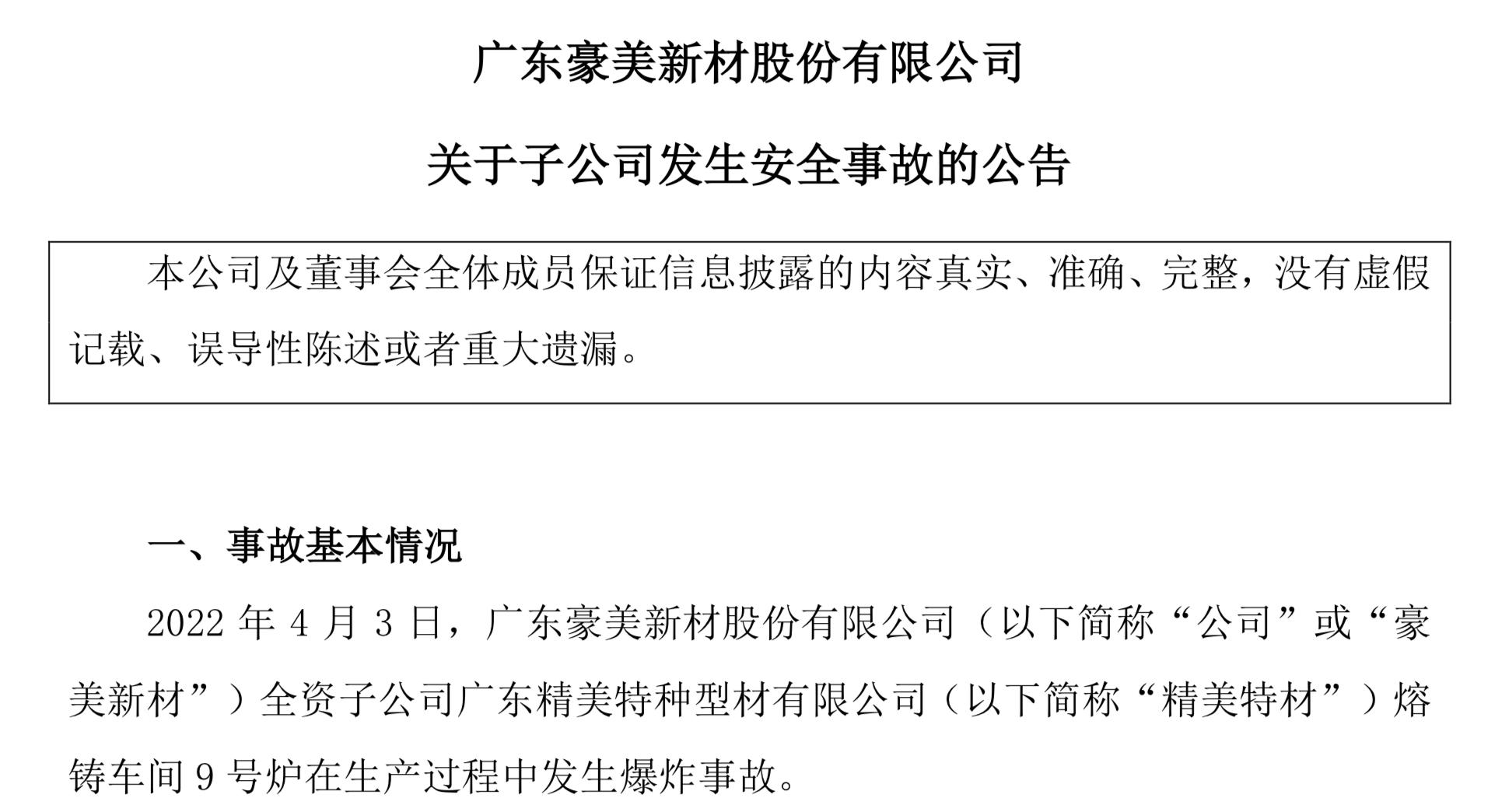 4月6日,豪美新材(002988.SZ)发布的公告显示,全资子公司广东精美特种型材有限公司(下称“精美特材”)熔铸车间9号炉在生产过程中发生爆炸事故。本次事故造成4人死亡、1人重伤,伤者已及时送往医院救治。