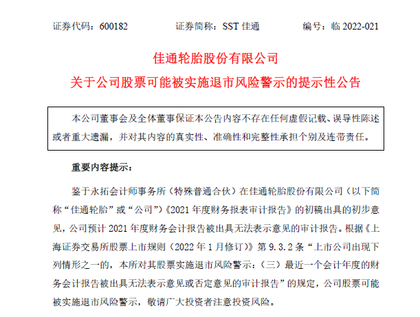 相关公司中,SST佳通(600182.SH)在4月5日发布的公告引发市场广泛关注,公告显示,鉴于永拓会计师事务所(特殊普通合伙)在该公司《2021年度财务报表审计报告》的初稿出具的初步意见,预计2021年度财务会计报告被出具无法表示意见的审计报告。该公司股票可能被实施退市风险警示。