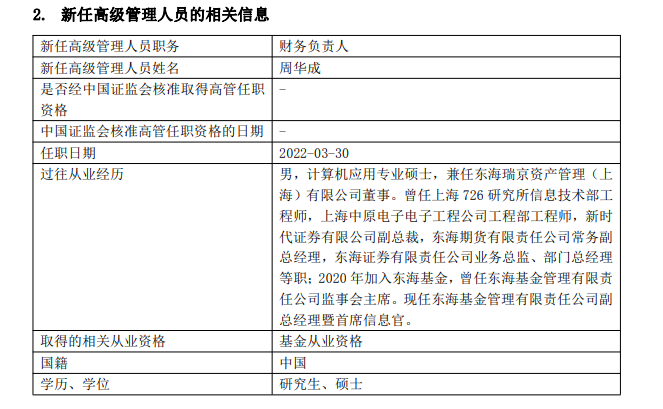 4月1日,东海基金管理有限责任公司(下称“东海基金”)发布高级管理人员变更公告称,周华成于3月30日成为新任财务负责人。