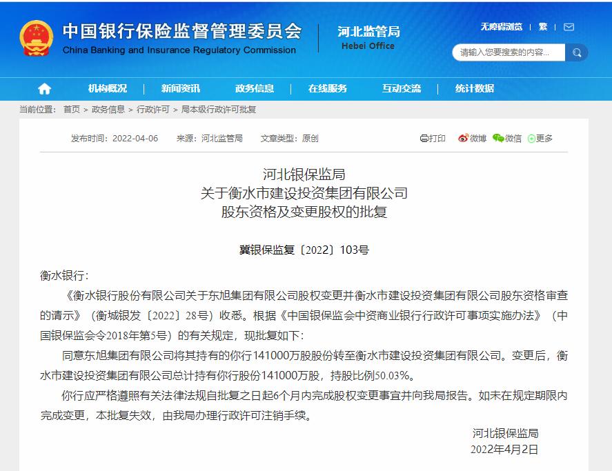 4月6日,中国银保监会河北监管局发布衡水银行股份有限公司(下称“衡水银行”)股东资格及变更股权被批复的公告。