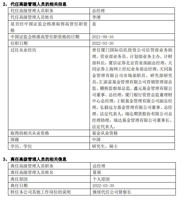 夏萌于2020年12月30日开始担任瑞达基金总经理至今,原总经理徐剑钧因个人原因离任;李湧2021年10月进入瑞达基金担任董事长,瑞达基金原董事长刘世鹏因身体原因离任。