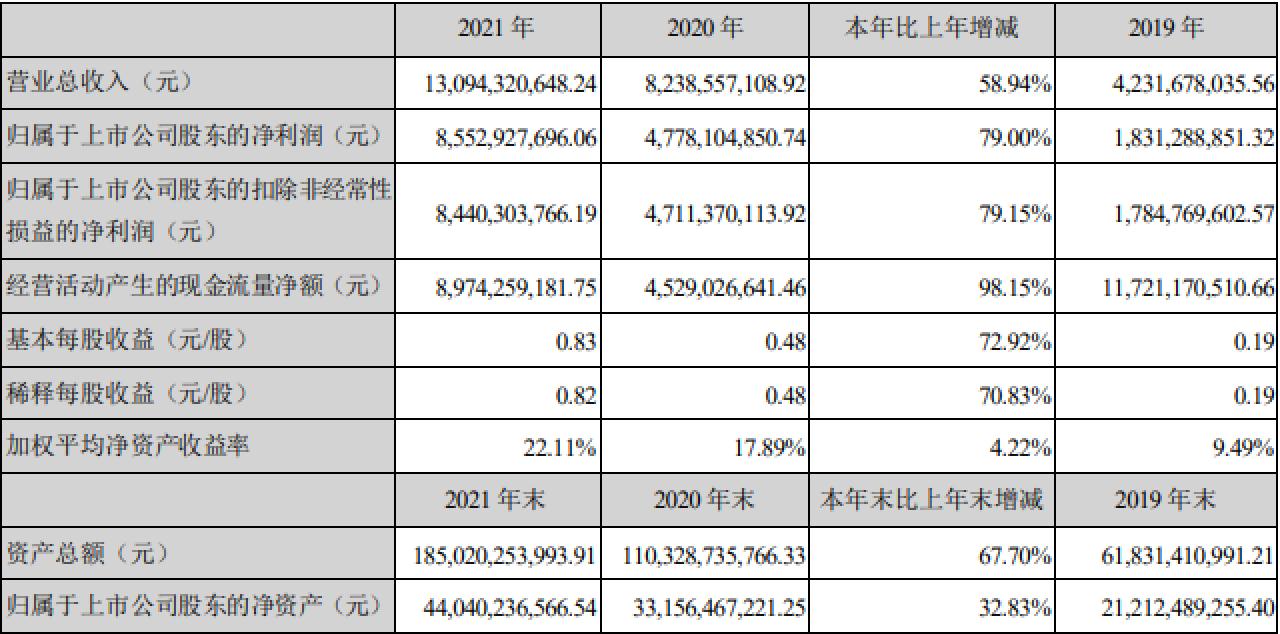 近年来,东方财富的业绩也持续提升。2019年至2021年,东方财富的营业总收入分别为42.32亿元、82.39亿元、130.94亿元,净利润分别为18.31亿元、47.78亿元、85.53亿元。