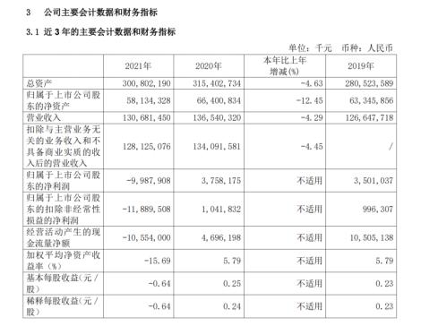 4月19日,上海电气(601727.SH)发布年报称,2021年实现营业收入1306.81亿元,同比下降4.29%;实现归属于上市公司股东的净利润-99.88亿元,2020年同期为37.58亿元。