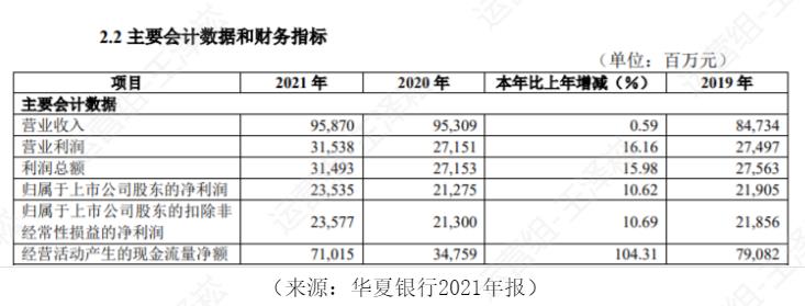 4月29日,华夏银行(600015.SH)发布的年报显示,2021年实现营业收入958.70亿元,同比增0.59%;实现归属于上市公司股东的净利润235.35亿元,同比增10.62%。
