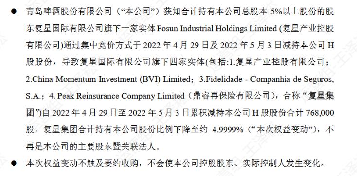 5月6日晚间,青岛啤酒(600600.SH)发布公告表示,2022年4月29日至2022年5月3日,复星国际(00656.HK)旗下一家实体Fosun Industrial Holdings Limited(复星产业控股有限公司)通过集中竞价方式转让H股股份76.80万股,导致复星集团持有股份比例占5%以下,不再是主要股东暨关联法人。