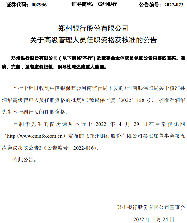 5月23日,郑州银行(002936.SZ)发布的公告显示,孙润华担任副行长的任职资格获批。