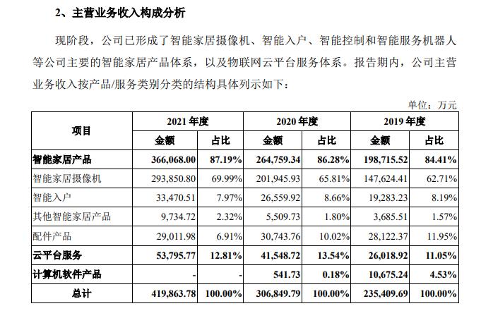 2019-2021年,萤石网络智能家居产品分别实现营收19.87亿元、26.48亿元、36.61亿元,营收占比分别为84.41%、86.28%、87.19%;云平台服务分别实现营2.60亿元、4.15亿元、5.38亿元,营收占比分别为11.05%、13.54%、12.81%。