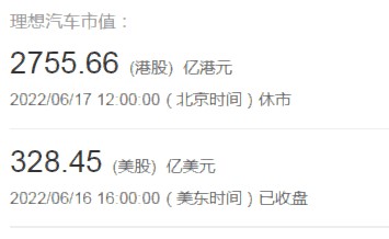 3.理想市值:2755.66(港股)亿港元、328.45(美股)亿美元。