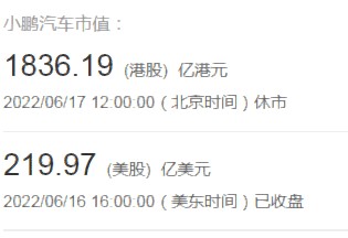 2. 小鹏汽车:1836.19(港股)亿港元、219.97(美股)亿美元;